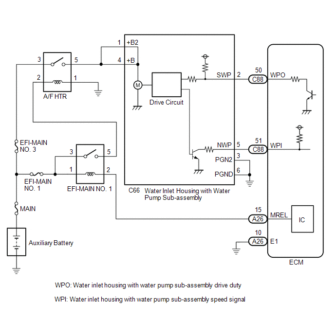 | P26CA12 | Engine Coolant Pump Circuit Short to Battery | The operation duty ratio signal (WPO) of the water inlet housing with water pump sub-assembly is a certain value or more when the water inlet housing with water pump sub-assembly operation signal is being output (1 trip detection logic). |