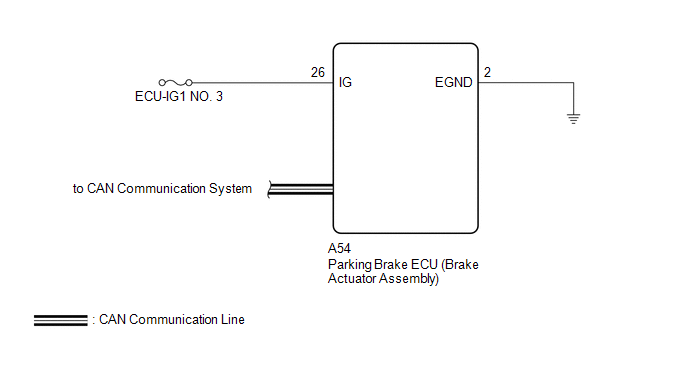 When the power switch is turned on (IG), power is supplied to the parking brake ECU (brake actuator assembly). This DTC is stored if IG power source voltage is not supplied to the parking brake ECU (brake actuator assembly) when communication with other ECUs is established.