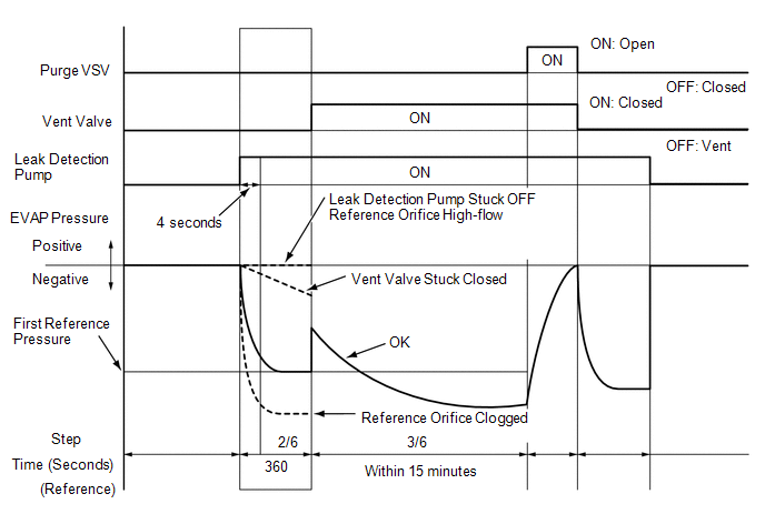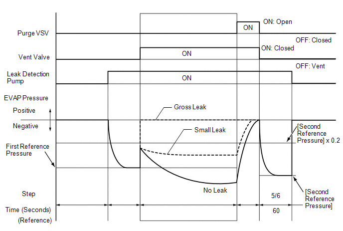 The leak detection pump creates negative pressure (vacuum) in the EVAP system and the pressure is measured. Finally, the ECM monitors for leaks from the EVAP system, and malfunctions in both the canister pump module and purge VSV based on the EVAP pressure.