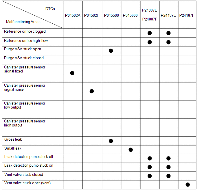 If any EVAP system DTCs are output, the malfunctioning area can be determined using the table below.