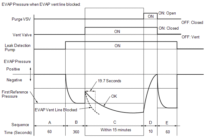 | E | Second reference pressure measurement | After second reference pressure measurement, leak check is performed by comparing first and second reference pressure measurements. If stabilized system pressure is higher than second reference pressure, ECM determines that EVAP system is leaking. | 60 seconds |