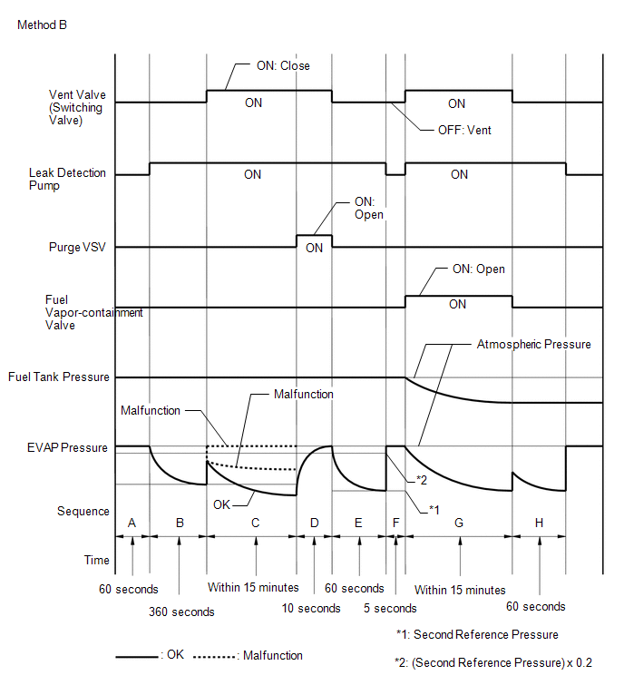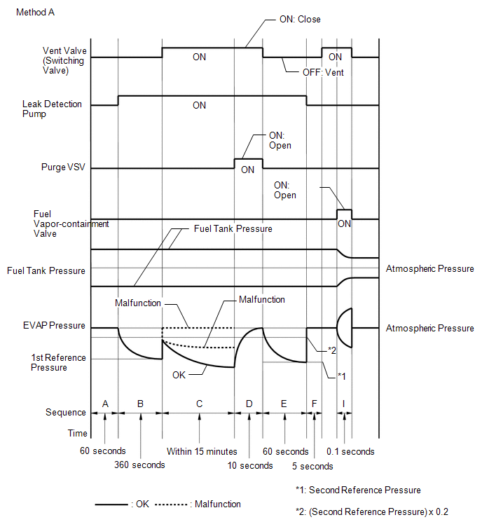 In operation C, the leak detection pump creates negative pressure (vacuum) in the EVAP system and the EVAP system pressure is measured. If the stabilized system pressure is higher than the second reference pressure, the ECM determines that the EVAP system has a small leak, illuminates the MIL and stores the DTC (2 trip detection logic).