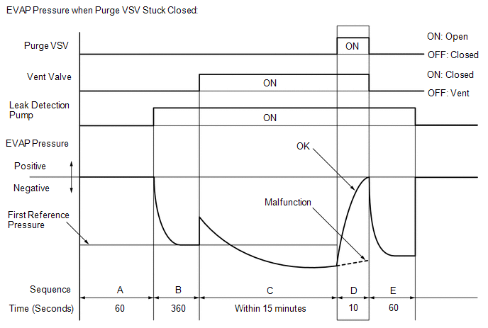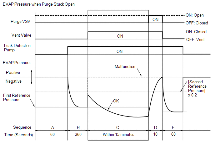 | E | Second reference pressure measurement | After second reference pressure measurement, leak check is performed by comparing first and second reference pressure measurements. If stabilized system pressure is higher than second reference pressure, ECM determines that EVAP system leaking. | 60 seconds |