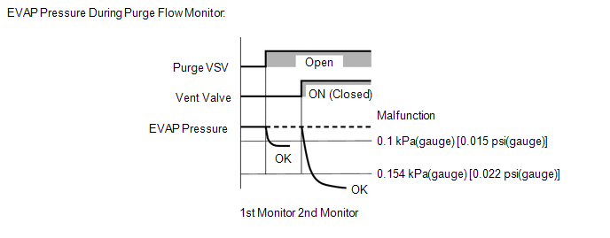 While the engine is running and the purge VSV is on (open), the ECM monitors the purge flow by measuring the EVAP pressure change. If negative pressure is not created, the ECM begins the 2nd monitor.