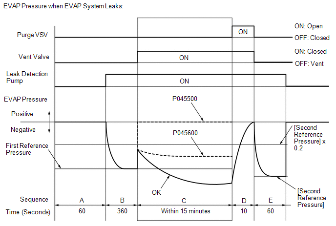 | E | Second reference pressure measurement | After second reference pressure measurement, leak check is performed by comparing first and second reference pressure measurements. If stabilized system pressure is higher than second reference pressure, ECM determines that EVAP system is leaking. | 60 seconds |