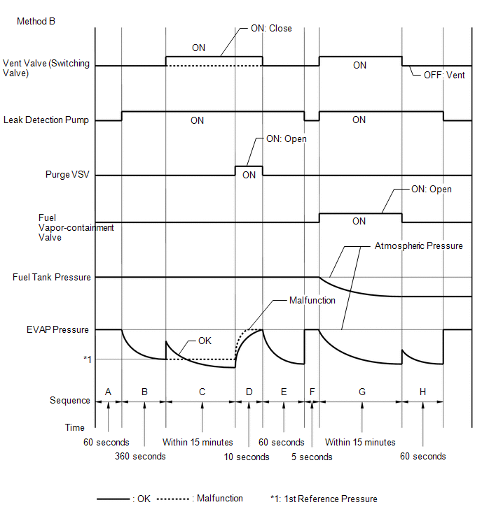In operation C, the vent valve turns on (closed) and the EVAP system pressure is then measured by the ECM using the canister pressure sensor to conduct an EVAP leak check. If the pressure does not increase when the vent valve is open, the ECM interprets this as the vent valve being stuck open. In this case the ECM will illuminate the MIL and store this DTC.