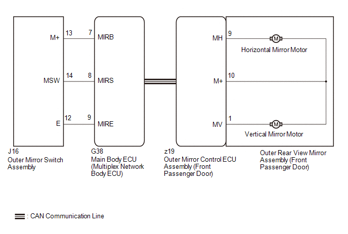 The outer mirror switch assembly sends the mirror adjust switch signals to the main body ECU (multiplex network body ECU). The main body ECU (multiplex network body ECU) then sends the received mirror adjust switch signals to the outer mirror control ECU assembly (front passenger door) via CAN communication. On receiving the signal, the outer mirror control ECU assembly (front passenger door) operates the vertical and horizontal mirror motors, which are built into the outer rear view mirror assembly (front passenger door), to adjust the mirror surface position.
