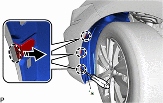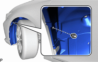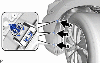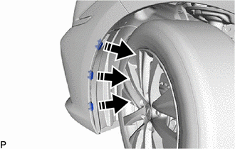(c) Disengage the 6 claws to remove the 3 pin hold clips from the rear fender splash shield sub-assembly as shown in the illustration.