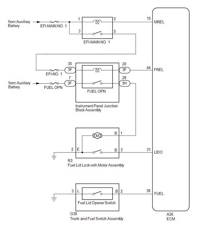 When the trunk and fuel switch assembly (fuel lid opener switch) is pushed, a trunk and fuel switch assembly (fuel lid opener switch) signal is sent to the ECM. The ECM turns on the FUEL OPN relay and EFI-MAIN NO. 1 relay, and the fuel lid lock with motor assembly opens the fuel lid. When the fuel lid is open, a fuel lid courtesy switch signal is output from the fuel lid lock with motor assembly.