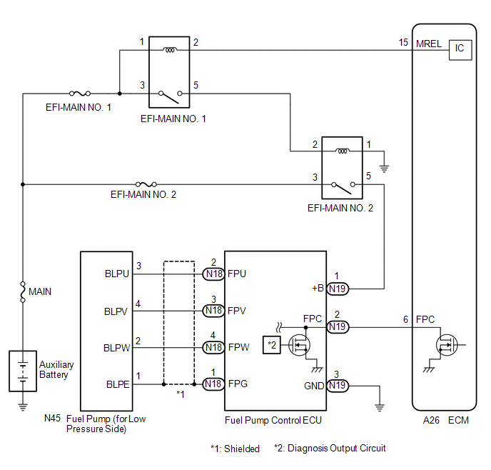 The fuel pump control ECU controls the speed of the fuel pump (for low pressure side) by switching the current of FPU, FPV and FPW based on operation signals output from the ECM.