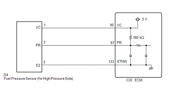If the fuel pressure sensor (for high pressure side) output voltage is less than 0.2933 V for 3 seconds or more, the ECM store this DTC.