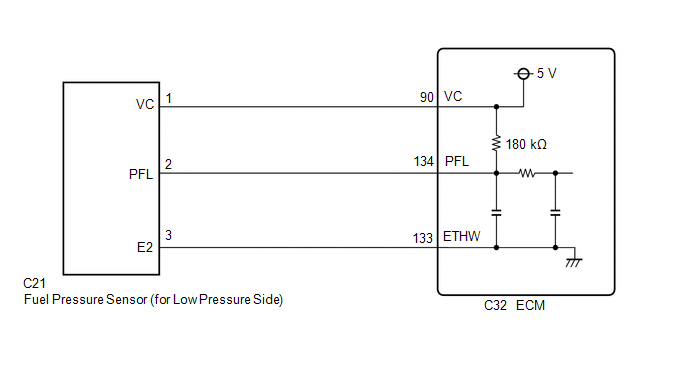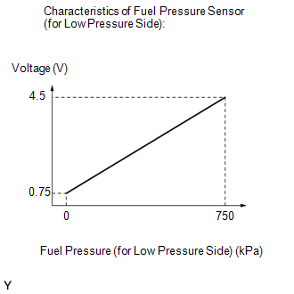 This DTC is stored if the fuel pressure sensor (for low pressure side) output voltage is out of the standard range due to an open or short in the sensor circuit.