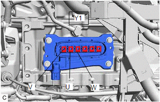 | (c) Check the generator (MG1) for an interphase short using a milliohmmeter. (1) Using a milliohmmeter, measure the resistance according to the value(s) in the table below. HINT: If the generator (MG1) temperature is high, the resistance will vary greatly from the specification. Therefore, measure the resistance at least 8 hours after the vehicle has been stopped. Standard Resistance: