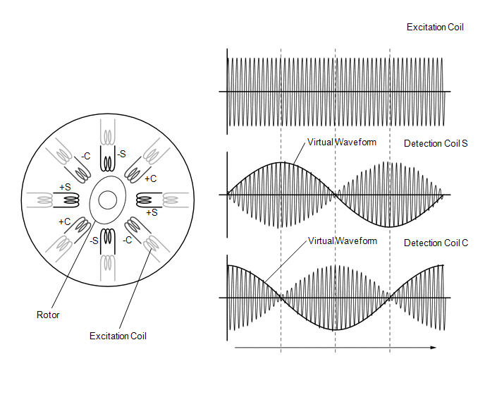Each resolver contains a stator that has an excitation coil and 2 detection coils (S, C). The gap between the stator and rotor changes as the rotor turns because the rotor is oval shaped. An alternating current with a predetermined frequency flows through the excitation coil, and detection coils S and C output alternating currents in accordance with the sensor rotor position.