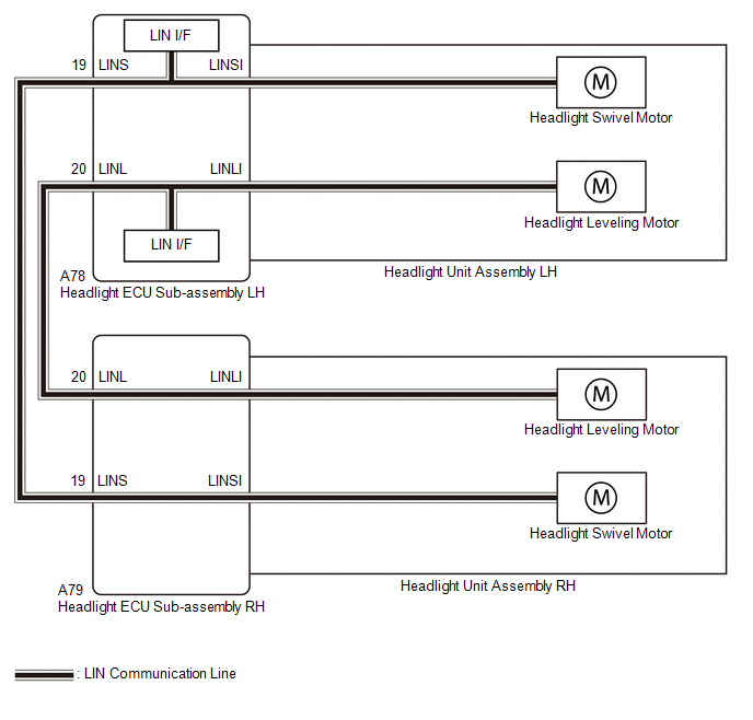 Each headlight ECU sub-assembly and headlight swivel motor and headlight leveling motor communicate via LIN communication.