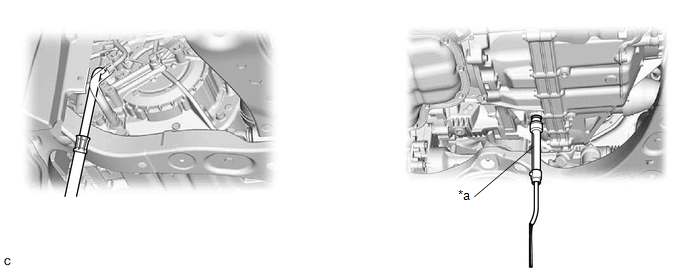 | (t) Install SST (adapter 18) to SST (overflow level gauge) and then install SST (overflow level gauge) to the overflow plug hole by hand until it is fully seated against the transaxle housing. SST: 09993-01100 SST: 09993-19025 09993-10010 09993-01010 NOTICE: Ensure that the sliding tube of SST (overflow level gauge) is fully retracted into the housing of SST (overflow lever gauge) before inserting it into the overflow plug hole. HINT: The level/measurement indicator on SST (overflow level gauge) will read 0 mm (0 in.) when the sliding tube of SST (overflow level gauge) is fully retracted. |