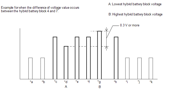 | The difference between the lowest and highest Hybrid Battery Block Voltage is 0.3 V or more. | B |