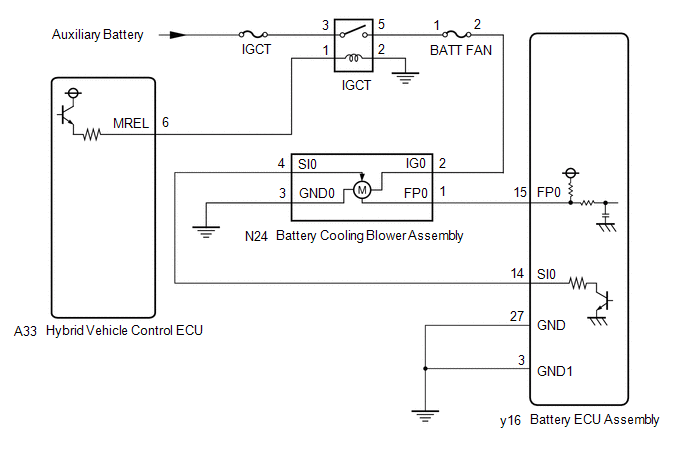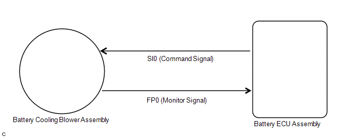 The battery cooling blower assembly speed is controlled by the battery ECU assembly. Power is supplied to the battery cooling blower assembly when the MREL terminal of the hybrid vehicle control ECU turns on the IGCT relay. The battery ECU assembly sends command signals (SI0) to the battery cooling blower assembly to adjust the fan speed to an appropriate speed for the HV battery temperature. The frequency (FP0) of the battery cooling blower assembly is sent to the battery ECU assembly as a monitor signal.