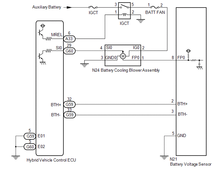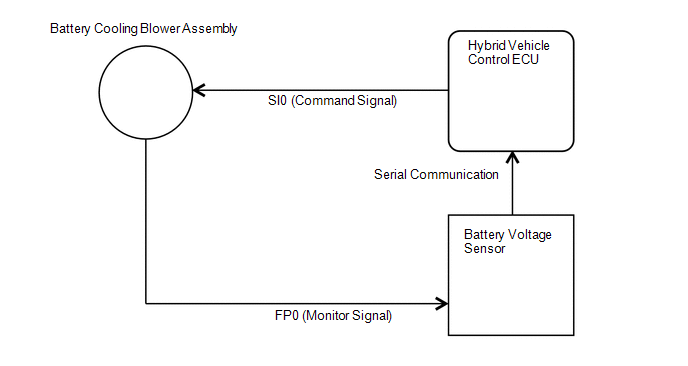 The battery cooling blower assembly speed is controlled by the hybrid vehicle control ECU. Power is supplied to the battery cooling blower assembly when the MREL terminal of the hybrid vehicle control ECU turns on the IGCT relay. The hybrid vehicle control ECU sends command signals (SI0) to the battery cooling blower assembly to adjust the fan speed to an appropriate speed for the HV battery temperature. The frequency (FP0) of the battery cooling blower assembly is sent to the hybrid vehicle control ECU via the battery voltage sensor as a monitor signal using serial communication.