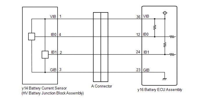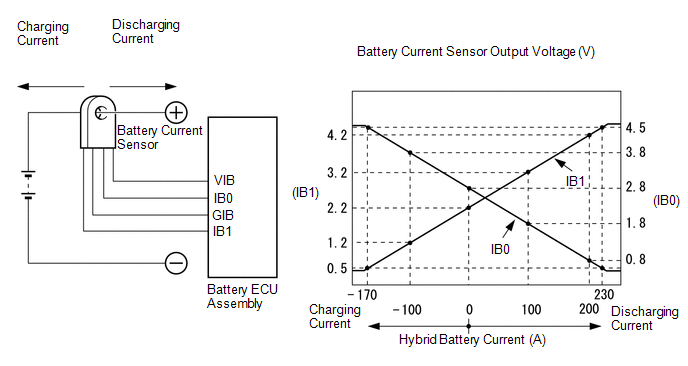 A battery current sensor, which is mounted on the positive cable side of each HV battery junction block assembly, detects the current flowing to or from the battery pack. The battery current sensor sends a voltage, which varies between 0 and 5 V in proportion to the amperage, to the IB0 terminal of the battery ECU assembly. Similarly, it sends a voltage, which varies between 0 and 5 V in inverse proportion to the amperage, to the IB1 terminal of the battery ECU assembly. When the voltage at the IB0 terminal is below 2.8 V and the voltage at the IB1 terminal is above 2.2 V, this indicates that the HV battery is being discharged. Additionally, Meanwhile, when the voltage at of the IB0 terminal is above 2.8 V and the voltage at of the IB1 terminal is below 2.2 V, this indicates that the HV battery is being charged. The battery ECU assembly sends the signals from its IB0 and IB1 terminals to the hybrid vehicle control ECU. The hybrid vehicle control ECU determines the charging and discharging amperage of the HV battery based on the received signals and calculates the SOC of the HV battery using the cumulative amperage value.