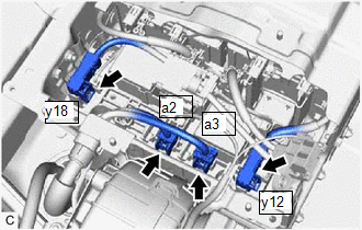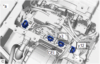 | (c) Disconnect the 2 HV floor under wire connectors from the HV battery junction block assembly. |