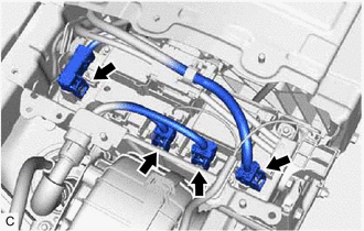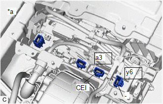 | (c) Disconnect the 2 HV floor under wire connectors from the HV battery junction block assembly. |