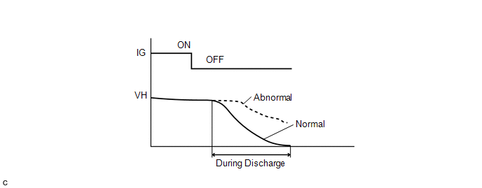 When the power switch is turned from on (READY) to off, the MG ECU discharges voltage stored in the inverter by allowing current to flow to motor (MG2) without generating torque. When the vehicle is normal, VH voltage becomes approximately 0 V after discharging. If VH voltage exceeds a specified value, this DTC is stored.