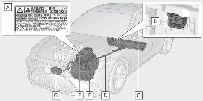 Take care when handling the hybrid system, as it is a high voltage system (about 650 V at maximum) as well as contains parts that become extremely hot when the hybrid system is operating. Obey the warning labels attached to the vehicle.