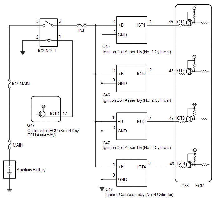 | 3 (IG2 NO. 1 relay) - C48-1 (+B) | Always | Below 1 Ω |