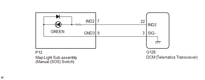 | 3. | CHECK HARNESS AND CONNECTOR (DCM (TELEMATICS TRANSCEIVER) - MAP LIGHT SUB-ASSEMBLY (MANUAL (SOS) SWITCH)) |