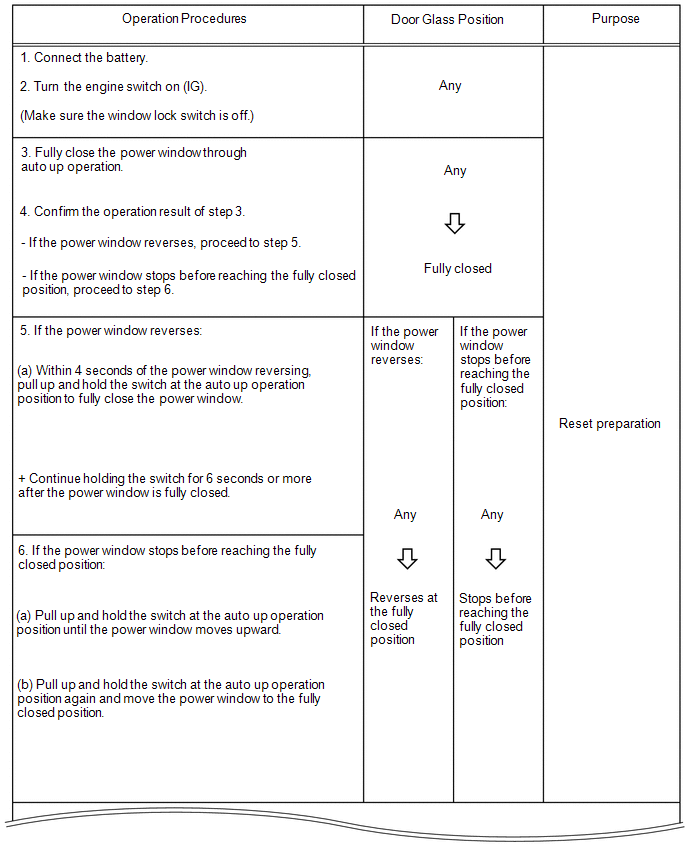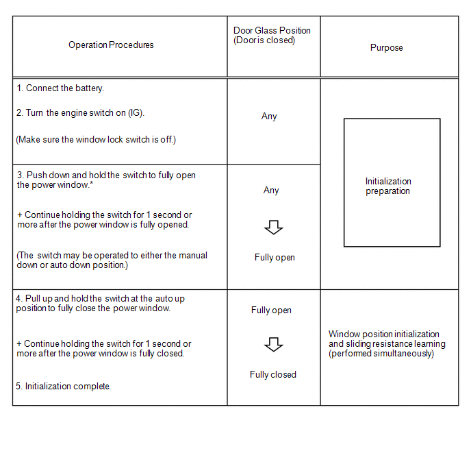 *: Even if the door glass is in the fully open position before performing step 3, push down and hold the switch for 1 second or more.