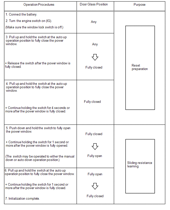 Reset the power window position, perform window position initialization (fully closed, fully opened) and sliding resistance learning.