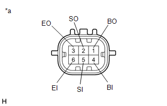 | (a) Measure the resistance according to the value(s) in the table below. Standard Resistance: | Tester Connection | Condition | Specified Condition | | 4 (BI) - 6 (EI) | Always | 10 kΩ or higher | | 4 (BI) - 1 (BO) | Always | Below 1 Ω | | 5 (SI) - 2 (SO) | Always | Below 30 Ω | | 6 (EI) - 3 (EO) | Always | Below 1 Ω | If the result is not as specified, replace the front center ultrasonic sensor. | | | *a | Component without harness connected (Front Center Ultrasonic Sensor) | | |