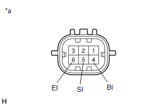 | (1) Measure the resistance according to the value(s) in the table below. Standard Resistance: | Tester Connection | Condition | Specified Condition | | 4 (BI) - 6 (EI) | Always | 10 kΩ or higher | | 4 (BI) - 1 | Always | Below 1 Ω | | 5 (SI) - 2 | Always | Below 30 Ω | | 6 (EI) - 3 | Always | Below 1 Ω | If the result is not as specified, replace the rear corner ultrasonic sensor LH. | | | *a | Component without harness connected (Rear Corner Ultrasonic Sensor LH) | | |