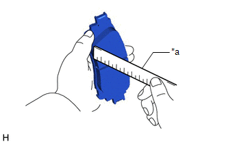 | (a) Using a ruler, measure the rear disc brake pad lining thickness. Standard Thickness: 9.5 mm (0.374 in.) Minimum Thickness: 1.0 mm (0.0394 in.) If a rear disc brake pad lining thickness is less than the minimum thickness, replace the rear disc brake pads. HINT: Be sure to check the rear disc thickness when replacing the rear disc brake pads with new ones. |