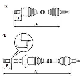 | (e) Check whether the drive shaft dimension (A) and (B) are within specification. NOTICE: Keep the drive shaft assembly level during inspection. Dimension (A): | for LH Side | 598.75 mm (1.96 ft.) | | for RH Side | 924.55 mm (3.03 ft.) | Dimension (B) (TMC Made): | for LH Side | 105.2 to 105.8 mm (4.15 to 4.16 in.) | | for RH Side | 97.3 to 98.3 mm (3.84 to 3.87 in.) | Dimension (B) (TMMK Made): | for LH Side | 105.2 to 105.8 mm (4.15 to 4.16 in.) | | for RH Side | 97.3 to 98.3 mm (3.84 to 3.87 in.) | | | | *A | for LH Side | | *B | for RH Side | | |