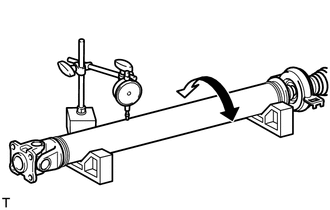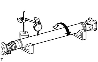 | (a) Using a dial indicator, measure the runout of the rear propeller shaft assembly (for front side). Maximum Runout: 0.6 mm (0.0236 in.) NOTICE: The dial indicator must be set at a right angle to the center of the rear propeller shaft assembly. If the shaft runout exceeds the maximum, replace the propeller with center bearing shaft assembly. |