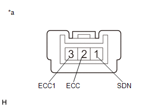 | (1) Measure the resistance according to the value(s) in the table below. Standard Resistance: | Tester Connection | Condition | Specified Condition | | 1 (SDN) - 2 (ECC) | "-" (Down shift) shift paddle switch operated and held | Below 2.5 Ω | | "-" (Down shift) shift paddle switch not operated | 1 MΩ or higher | | 1 (SDN) - 3 (ECC1) | "-" (Down shift) shift paddle switch operated and held | Below 2.5 Ω | | "-" (Down shift) shift paddle switch not operated | 1 MΩ or higher | If the result is not as specified, replace the shift paddle switch LH (transmission shift switch assembly). | | | *a | Component without harness connected (Shift Paddle Switch LH (Transmission Shift Switch Assembly)) | | |