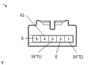| (b) Measure the resistance according to the value(s) in the table below. Standard Resistance: | Tester Connection | Condition | Specified Condition | | 4 (IG) - 5 (S) | Shift lever in S, "+" or "-" | Below 1 Ω | | Shift lever not in S, "+" or "-" | 10 kΩ or higher | | 3 (SFTU) - 2 (E) | Shift lever held in "+" (Up-shift) | Below 1 Ω | | Shift lever not held in "+" (Up-shift) | 10 kΩ or higher | | 1 (SFTD) - 2 (E) | Shift lever held in "-" (Down-shift) | Below 1 Ω | | Shift lever not held in "-" (Down-shift) | 10 kΩ or higher | If the result is not as specified, replace the shift lock control unit assembly. | | | *a | Component without harness connected (Transmission Control Switch (Shift Lock Control Unit Assembly)) | | |