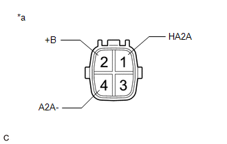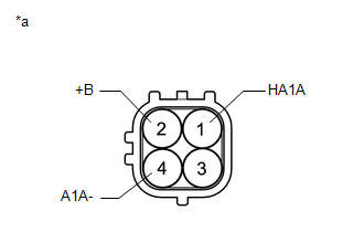 | (a) Measure the resistance according to the value(s) in the table below. Standard Resistance: | Tester Connection | Condition | Specified Condition | | 1 (HA2A) - 2 (+B) | 20°C (68°F) | 1.6 to 3.2 Ω | | 1 (HA2A) - 4 (A2A-) | Always | 10 kΩ or higher | If the result is not as specified, replace the air fuel ratio sensor. | | | *a | Component without harness connected (Air Fuel Ratio Sensor) | | |