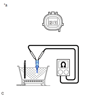 | (a) Measure the resistance according to the value(s) in the table below. Standard Resistance: | Tester Connection | Condition | Specified Condition | | 1 - 2 | 20°C (68°F) | 2.32 to 2.59 kΩ | | 80°C (176°F) | 0.310 to 0.326 kΩ | NOTICE: If checking the engine coolant temperature sensor in water, be careful not to allow water to contact the terminals. After checking, wipe the water off the engine coolant temperature sensor. If the result is not as specified, replace the engine coolant temperature sensor. | | | *a | Component without harness connected (Engine Coolant Temperature Sensor) | | |