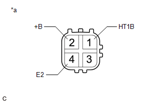 | (a) Measure the resistance according to the value(s) in the table below. Standard Resistance: | Tester Connection | Condition | Specified Condition | | 1 (HT1B) - 2 (+B) | 20°C (68°F) | 5 to 10 Ω | | 1 (HT1B) - 4 (E2) | Always | 10 kΩ or higher | If the result is not as specified, replace the heated oxygen sensor. | | | *a | Component without harness connected (Heated Oxygen Sensor) | | |