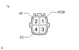 | (a) Measure the resistance according to the value(s) in the table below. Standard Resistance: | Tester Connection | Condition | Specified Condition | | 1 (HT2B) - 2 (+B) | 20°C (68°F) | 5 to 10 Ω | | 1 (HT2B) - 4 (E2) | Always | 10 kΩ or higher | If the result is not as specified, replace the heated oxygen sensor. | | | *a | Component without harness connected (Heated Oxygen Sensor) | | |