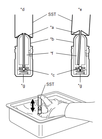 | (b) Insert the tip of SST into the plunger and use the tip to press down on the check ball inside the plunger. SST: 09276-75010 |