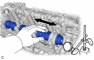 | (3) Using a dial indicator, measure the thrust clearance while moving each camshaft back and forth. Standard Thrust Clearance: 0.08 to 0.13 mm (0.00315 to 0.00512 in.) Maximum Thrust Clearance: 0.18 mm (0.00709 in.) HINT: