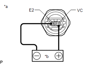 HINT: If a stable power supply is not available, connect 4 nickel-metal hydride batteries (1.2 V each) or equivalent in series. | | | *a | Component without harness connected (Fuel Pressure Sensor (Fuel Delivery Pipe with Sensor Assembly)) | | *b | Voltage Applied between Terminals | | |