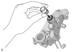 | (a) Coat the oil pump relief valve with engine oil and check that it falls smoothly into the valve hole by its own weight. HINT: If the oil pump relief valve does not fall smoothly, replace the timing chain cover assembly. |