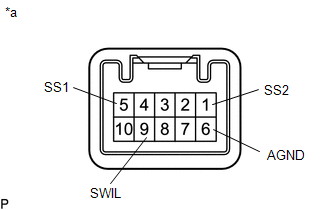 | (1) Measure the resistance according to the value(s) in the table below. Standard Resistance: | Tester Connection | Condition | Specified Condition | | 5 (SS1) - 6 (AGND) 1 (SS2) - 6 (AGND) | Not pushed | 10 kΩ or higher | | Pushed | Below 1 Ω | If the result is not as specified, replace the engine switch. | | | *a | Component without harness connected (Engine Switch) | | |