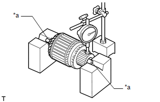 | (d) Check the commutator for runout. (1) Place the armature shaft on V-blocks. (2) Using a dial indicator, measure the runout. Maximum Runout: 0.05 mm (0.00197 in.) If the runout is greater than the maximum, replace the starter armature assembly. |