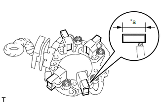 | (1) Using a vernier caliper, measure the brush length. Standard Length: 14.4 mm (0.567 in.) Minimum Length: 9.0 mm (0.354 in.) If the brush length is less than the minimum, replace the starter brush holder assembly. |